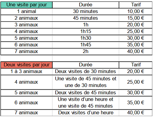 Je compte 15 minutes de plus (soit 4,5 euros) par animal supplémentaire, par jour.